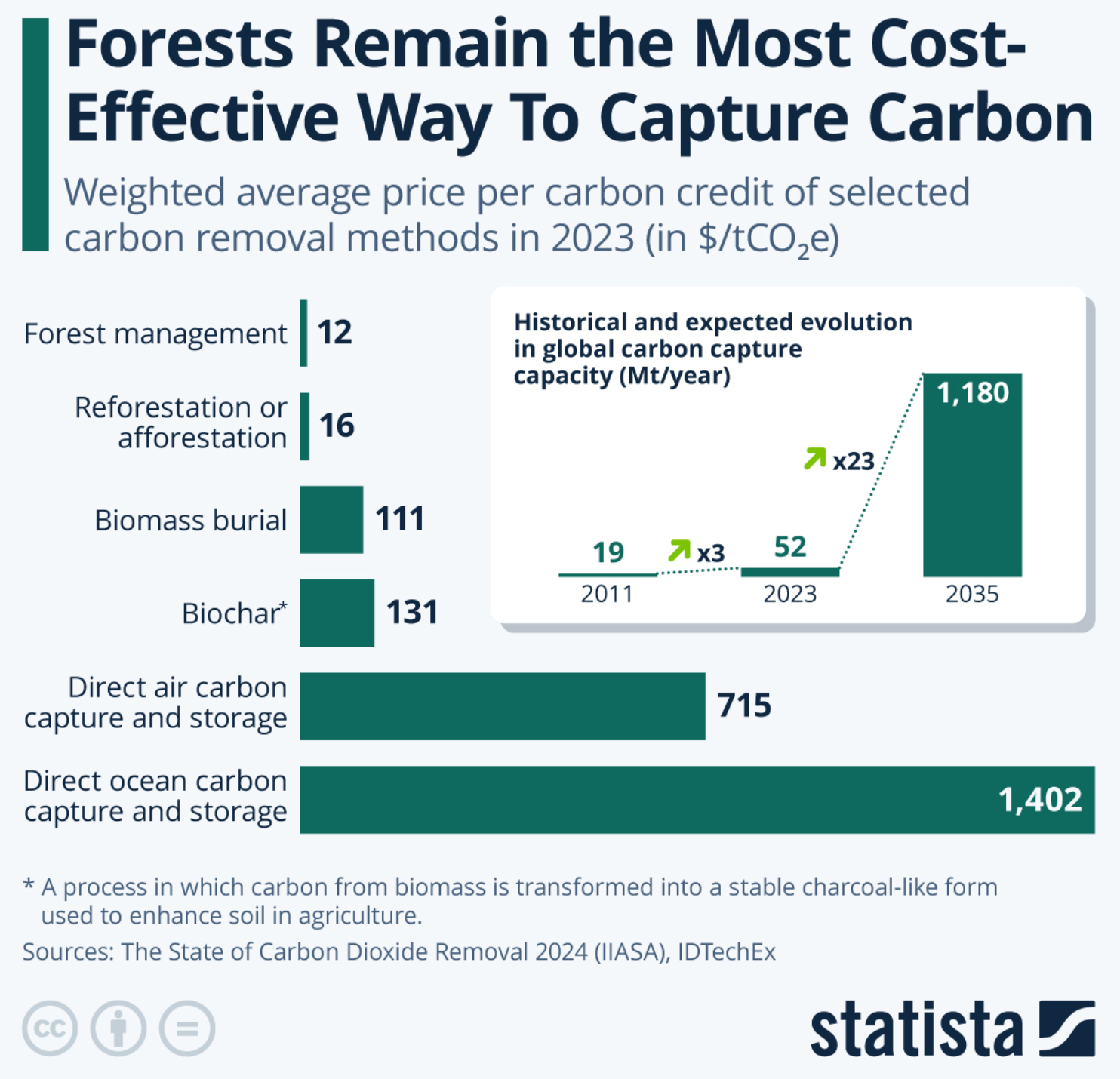 Enhancing or restoring biodiversity through NbS are cost-effective. According to The State of Carbon Dioxide Removal 2024 report, Nature-based solutions (NbS), like forest management and reforestation, are the most cost-effective Carbon dioxide removal (CDR) technology at $12–$16 per ton of CO₂ in 2023, but are constrained by land availability and risks like deforestation and wildfires. Mid-range options like biochar cost about ten times more ($130 per ton in 2023). Biochar is a mature technology that enhances soil health, but is limited by feedstock and the need for standardized methods. High-tech options, such as direct air and ocean carbon capture, are much more expensive, at $700–$1,400 per ton (2023 prices).
